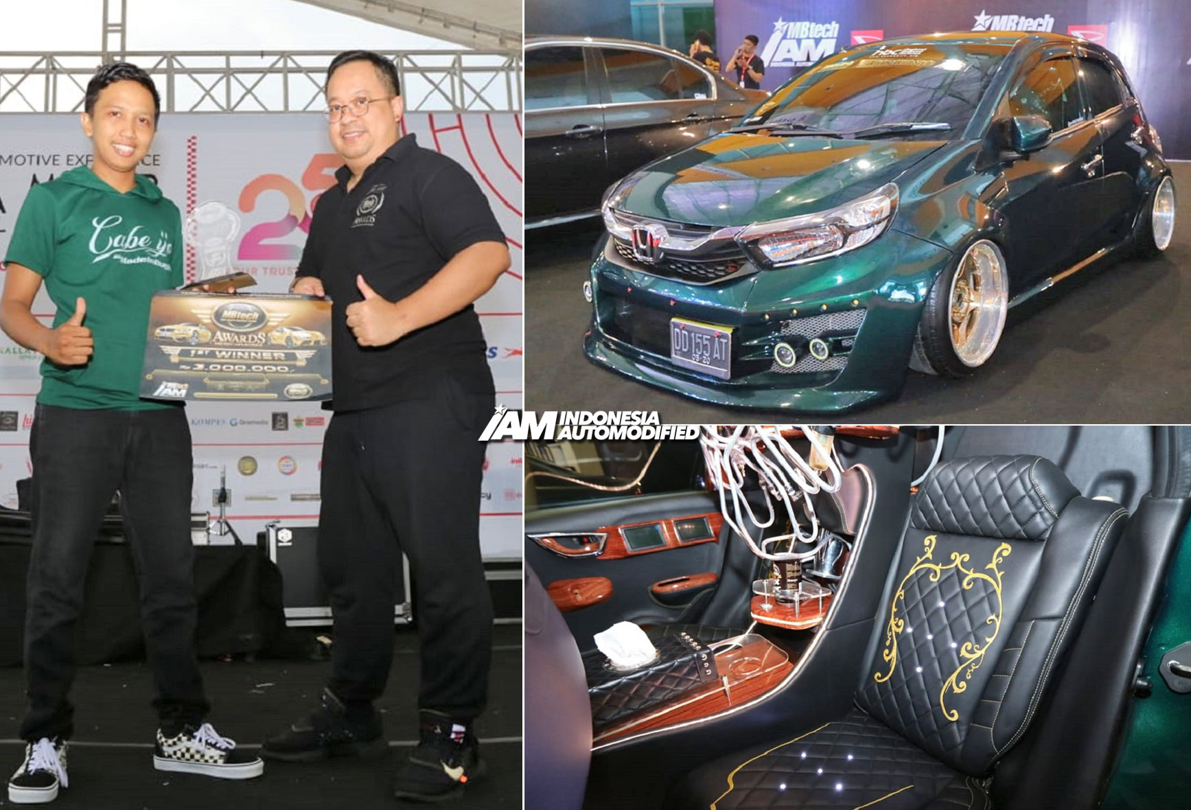 Sebagai pemenang Juara 1 direbut oleh Honda Brio, Cabe Ijo. Hadir dengan konsep modifikasi interior yang mewah, bermodalkan satu warna, bergaya vip, kombinasi pola kerut dengan finishing yang ciamik di permukaan jok, doortrim serta plafon menjadikannya nilai plus tersendiri di hadapan juri MBtech Awards 2019.