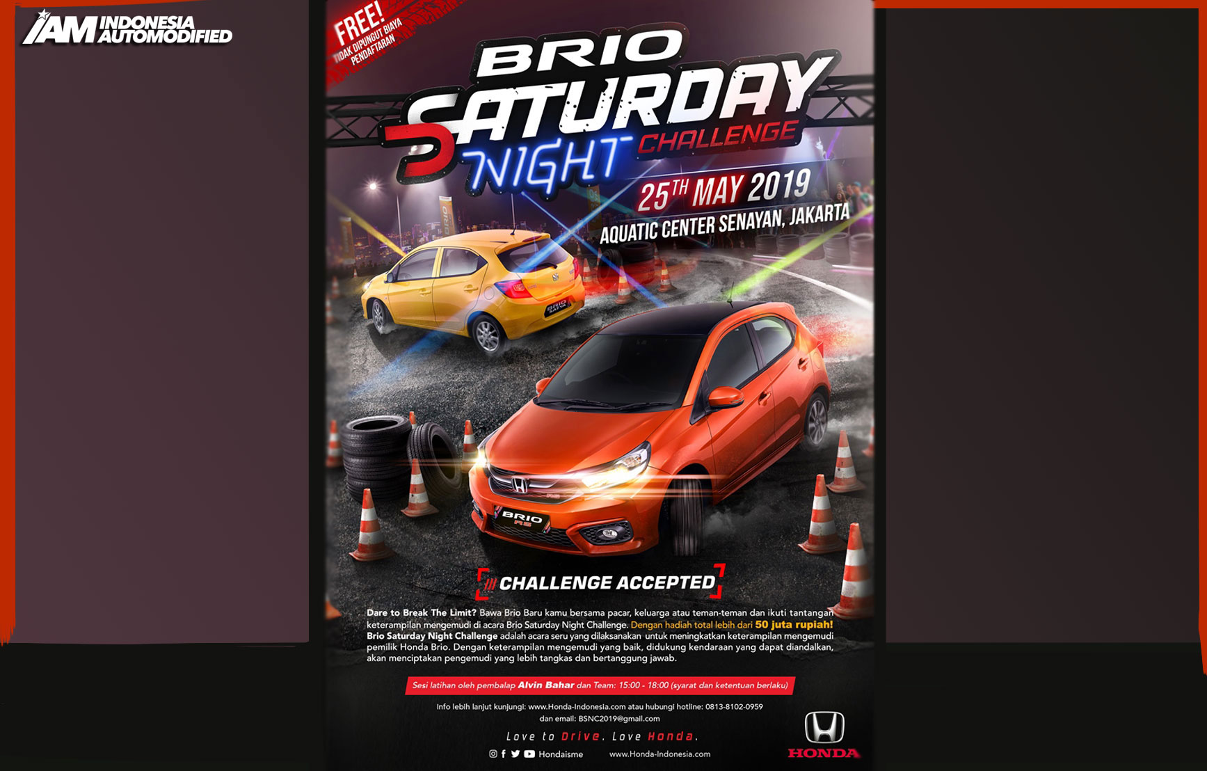 iamautomodified.com, JAKARTA – PT Honda Prospect Motor akan kembali menggelar ajang keterampilan mengemudi bertajuk Brio Saturday Night Challenge 2019 di Parkir Stadion Akuatik Senayan Jakarta, Sabtu, 25 Mei 2019 pekan ini.