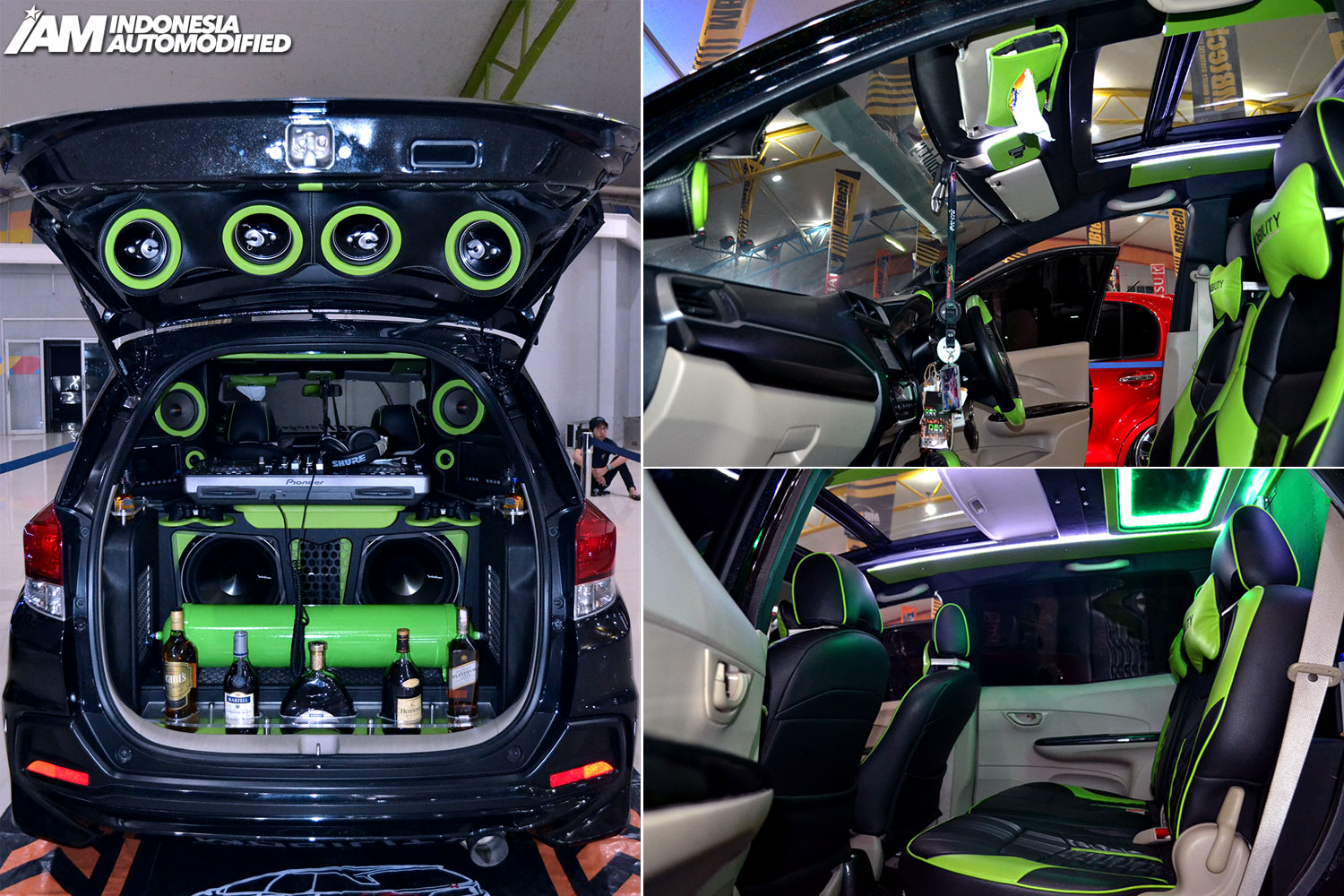 “Kalau untuk jok, masih standar bawaan Mobilio. Tapi kita lapis dengan bahan sintetis warna hitam dan hijau. Selain itu kita hiasi dengan aksesori seperti lampu-lampu interior. Kalau untuk perangkat sound system lengkap, mulai dari headunit, subwoofer, speaker ada PS3 dan monitor TV ditambah dengan minibar,” jelas Herry.