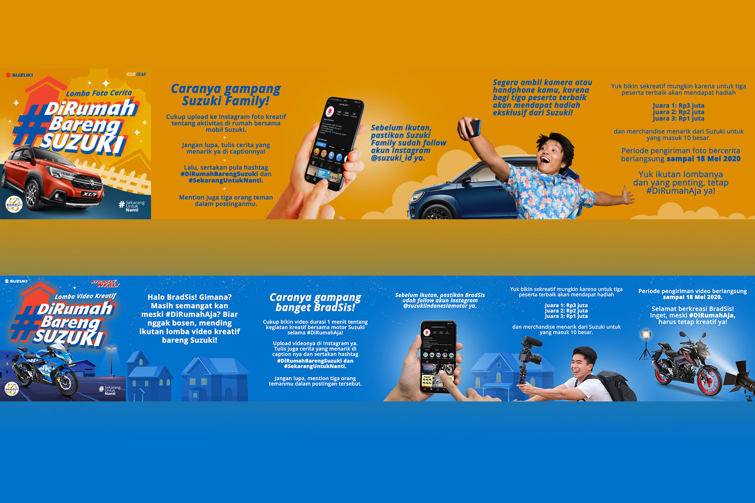 Video kreatif harus diunggah ke akun Instagram masing-masing dengan menyertakan tagar yang sama yaitu #DiRumahBarengSuzuki dan #SekarangUntukNanti serta mention akun Instagram Suzuki motor @suzukiindonesiamotor. Tentunya sudah disiapkan hadiah uang tunai dan hadiah menarik lainnya untuk para pemenang dari masing-masing kompetisi.