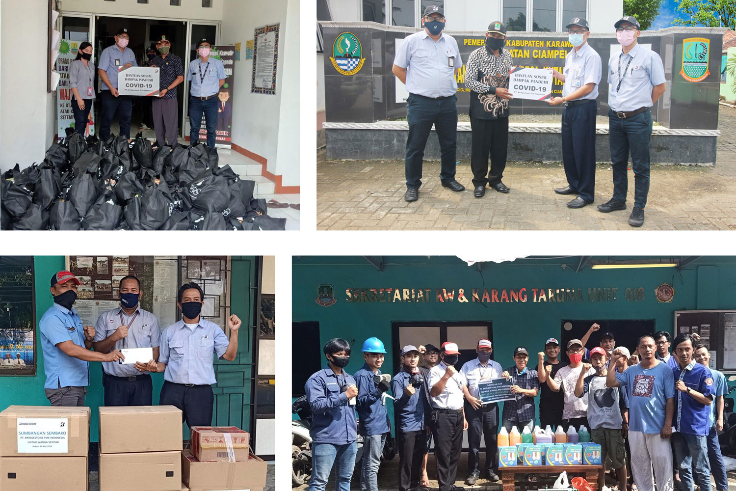 Dalam sebulan terakhir, Bridgestone Indonesia telah memberikan bantuan sosial kepada masyarakat setempat dalam berbagai bentuk, diantaranya mendistribusikan 45 liter sabun cuci tangan, melakukan kegiatan fogging untuk masyarakat di Desa Harapan Jaya Bekasi Utara, mendistribusikan paket sembako ke lebih dari 100 rumah tangga di Desa Kutanagara di Karawang, menyediakan seragam (rompi) kepada COVID-19 Emergency Response Team (ERT) Bekasi dan 50 paket makan malam (buka puasa) ke COVID-19 ERT KORAMIL Bekasi Utara.
