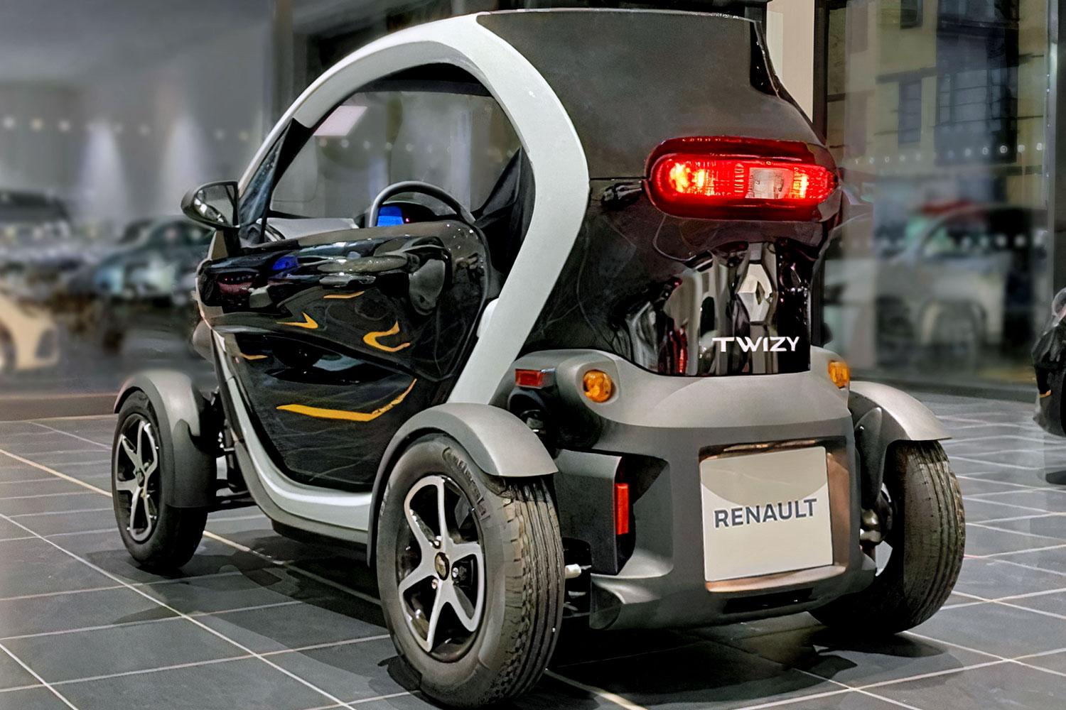 Bagian belakang Twizy lebih didominasi oleh lampu rem sekaligus lampu mundur berbentuk kapsul yang ada di tengah pintu bagasinya, serta terdapat logo Renault besar pada bagian bawah lampu rem.