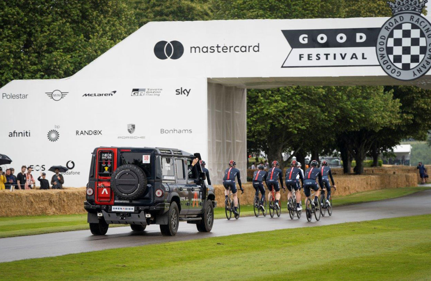Perwakilan tim sepeda INEOS Grenadiers antara lain peraih medali emas Olimpiade dari Inggris, Owain Doull, bintang baru dari Belgia Laurens De Plus, dan juara road race Inggris, Ben Swift. Pengemudi yang mengemudikan Grenadier menanjak bukit adalah Esteban Gutiérrez, pembalap F1 dari tim Mercedes-AMG Petronas.