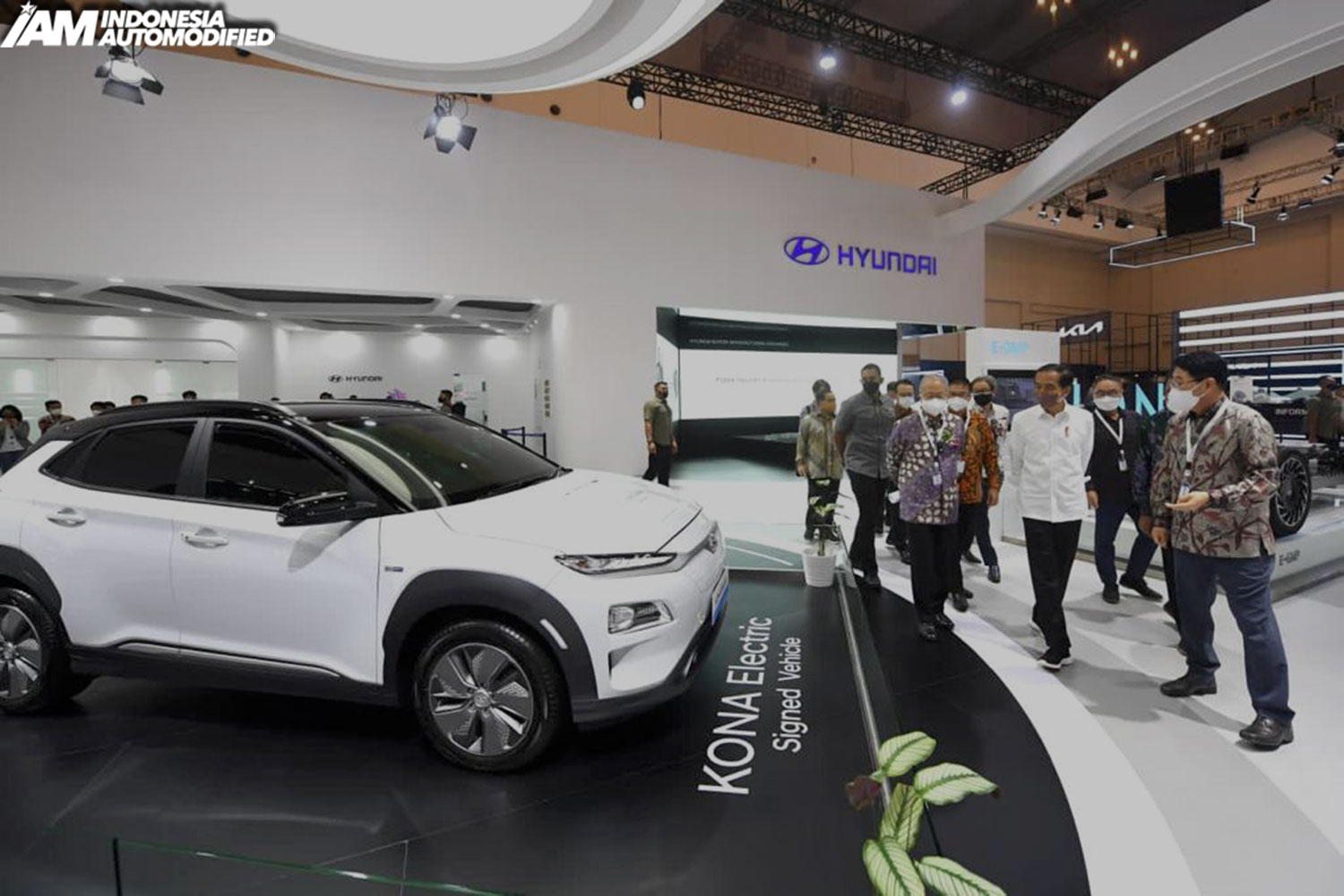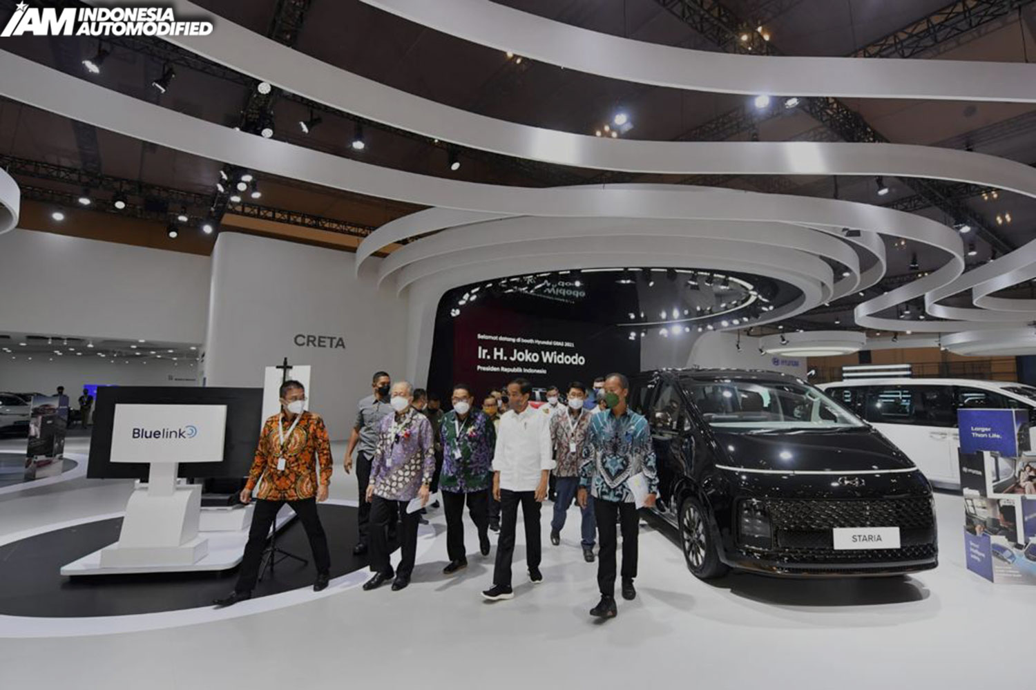 Presiden Republik Indonesia didampingi segenap manajemen Hyundai yaitu, Mr. Young Tack Lee – President Hyundai Motor Asia-Pacific Headquarters, Mr. SungJong Ha – President Director PT Hyundai Motors Indonesia, dan Makmur – Chief Operating Officer PT Hyundai Motors Indonesia, Menteri Perindustrian Agus Gumiwang Kartasasmita, beserta rombongan saat mengunjungi booth Hyundai di GIIAS 2021.