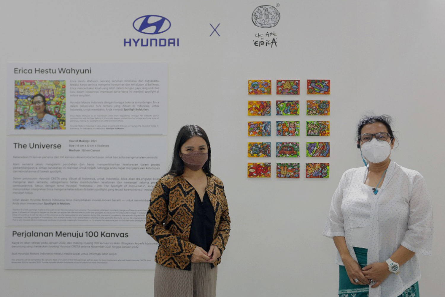Melalui kolaborasi ini, 100 pemesan Hyundai CRETA yang beruntung akan memperoleh lukisan eksklusif Erica. Lukisan-lukisan dari Erica akan membentuk satu kesatuan yang menggambarkan bagaimana Indonesia melangkah menuju spotlight dari sudut pandang seni, budaya, teknologi, dan keberlanjutan.