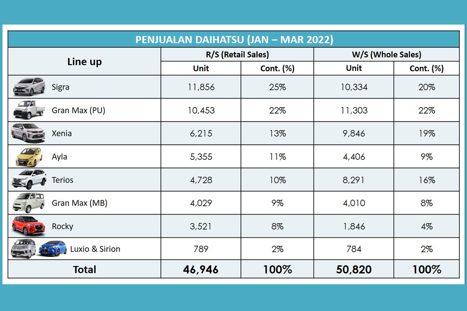 Secara berturut-turut, penjualan Daihatsu selama 3 bulanan didominasi oleh top 3 model, mulai dari Sigra sebanyak 11.856 unit, atau berkontribusi 25%; disusul Gran Max PU (Pick Up) sebanyak 10.453 unit (22%); dan Xenia yang kini masuk menjadi top 3 penjualan Daihatsu dengan raihan 6.215 unit (13%).
