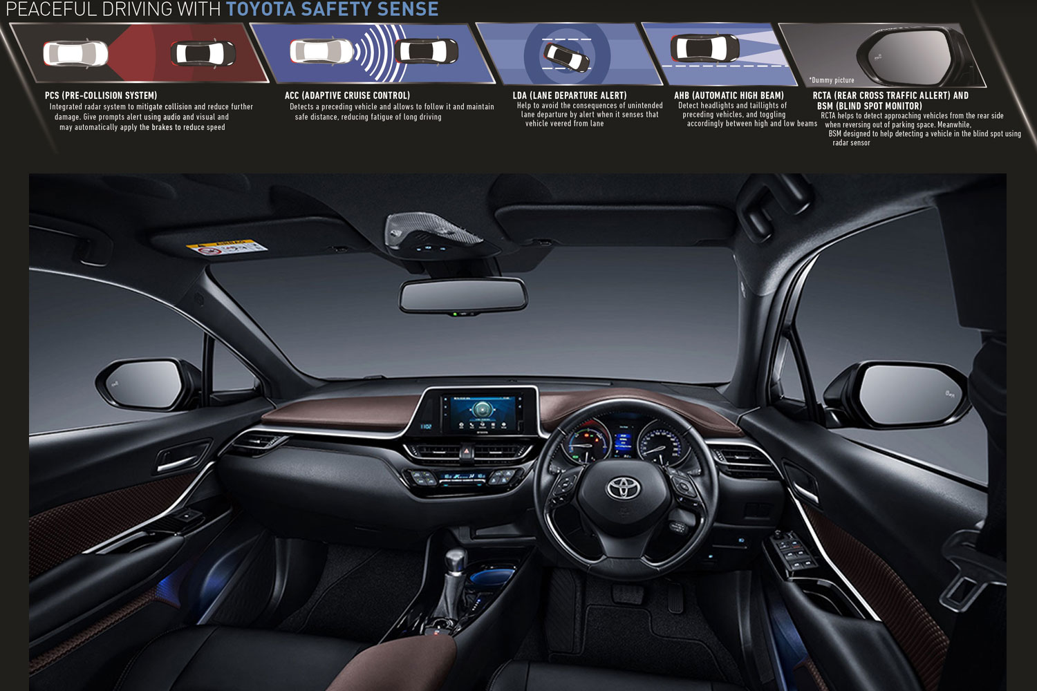 Toyota New C-HR Hybrid yang merupakan mobil hybrid pertama di kelasnya kini dilengkapi dengan teknologi keselamatan Toyota Safety Sense untuk memberikan keamanan yang lebih optimal kepada pelanggan. Fitur TSS yang kini dimiliki New C-HR Hybrid yaitu; (1) Pre-Collision System (PCS), (2) Dynamic Radar Cruise Control (DRCC), (3) Lane Departure Alert (LDA), (4) Automatic High Beam (AHB). Tidak hanya itu, New C-HR Hybrid juga dilengkapi berbagai fitur keselamatan lain seperti Rear Cross Traffic Alert (RCTA) dan Blind Spot Monitor (BSM).