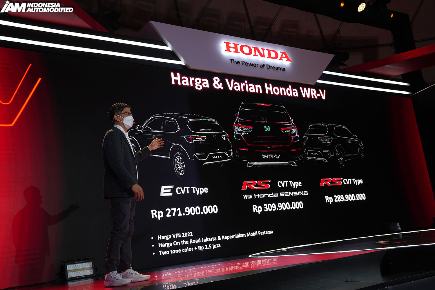 Honda WR-V tersedia dalam varian Honda WR-V Tipe E CVT dengan harga Rp. 271,9 juta, Honda WR-V Tipe RS CVT dengan harga Rp. 289,9 juta, dan Honda WR-V Tipe RS CVT with Honda SENSING dengan harga Rp. 309,9 juta. Harga VIN 2022, Harga On the Road Jakarta & BBN Kepemilikan Mobil Pertama, khusus Two tone color dikenakan penambahan Rp 2,5 juta.