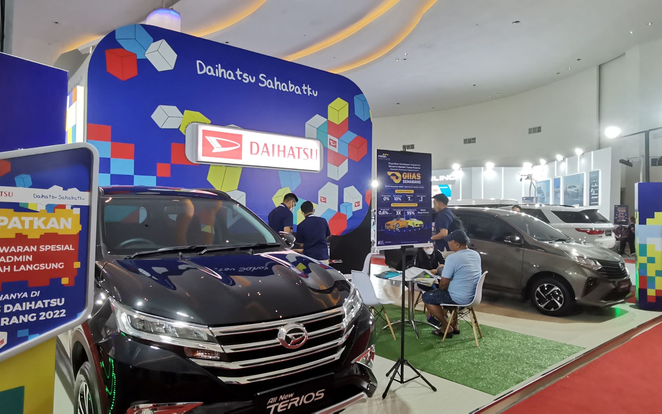 Daihatsu menampilkan total 4 unit di GIIAS 2022 Semarang, terdiri dari 1 unit Rocky R CVT, Sigra R A/T, Xenia 1.5 R CVT ASA, dan Terios R M/T. Selama penyelenggaraan, Booth Daihatsu siap menyambut para pengunjung dengan beragam paket penjualan spesial selama GIIAS 2022 Semarang berlangsung.
