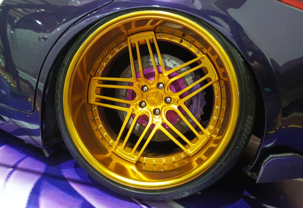 Tampilan agresif disempurnakan dengan velg double disk R20, dibalut ban depan ukuran 20×9.5 ET-25 dan belakang 20×12 ET-70 yang menancap kuat di aspal seperti cakar singa pada mangsanya.