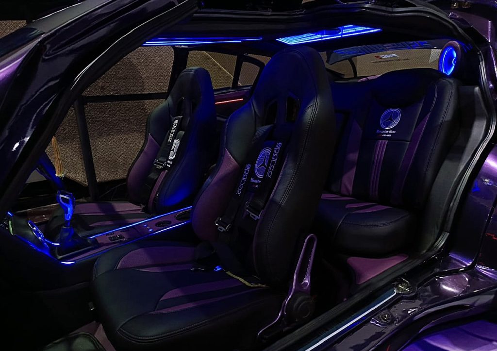 Bagian dalam? Jangan tanya. Lampu RGB interior dan logo Mercedes menyala di antara kursi racing full backlight, menjadikan kabin sebagai lounge eksklusif di luar angkasa.