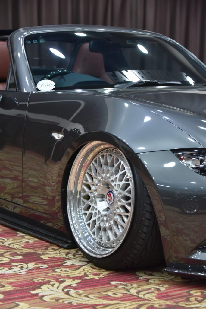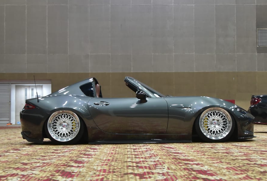 Dengan wide body kit custom yang menggembung garang di kiri-kanan, Miata ini tampil seperti sedang siap menyeruduk siapa pun yang berani menghalangi. Warna Grey Glossy di tubuhnya bukan sekadar cat, itu adalah peringatan visual bahwa mobil ini haus perhatian dan adrenalin.