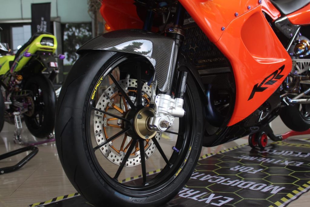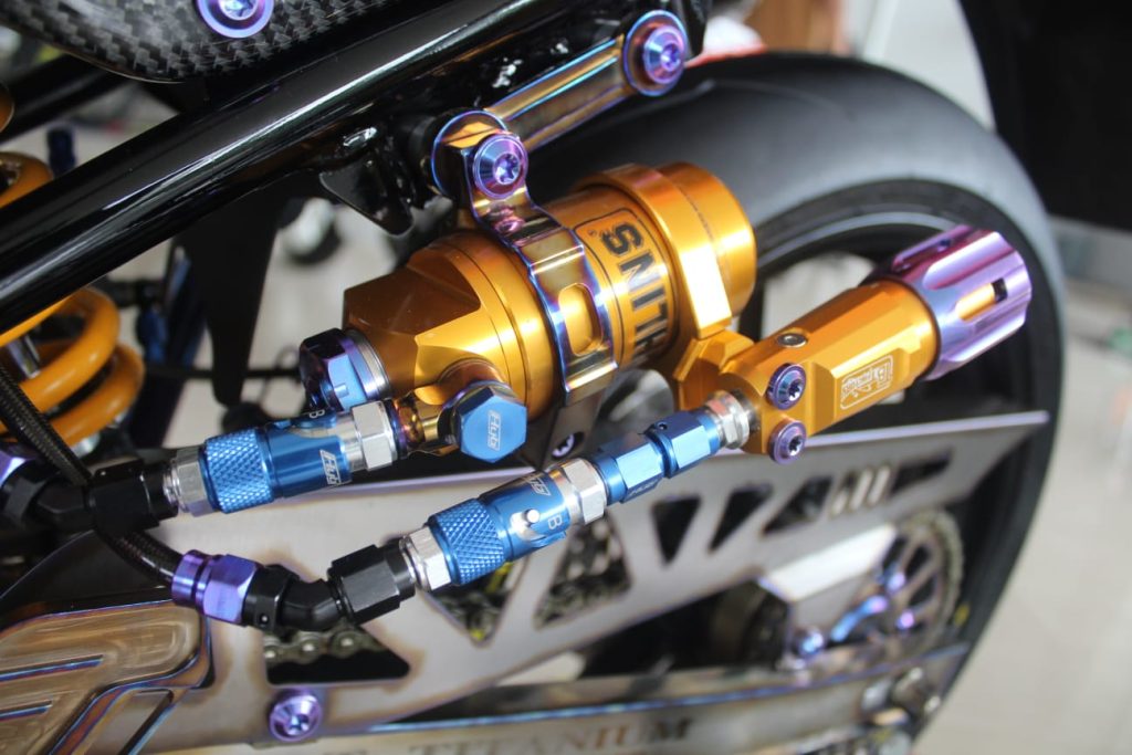 Motor ini dipersenjatai velg EXACT TOSTECH buatan Jepang yang prestisius, lalu dipadukan dengan suspensi Ohlins yang sudah dimodifikasi khusus dengan hydraulic preload serta quick release.
