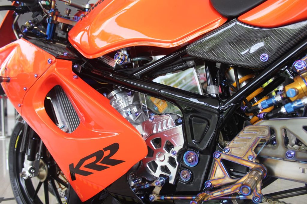 “Kalau Ninja RR SE itu kan versi lokalnya, sementara KR-JT itu lebih ke build up Thailand. Nah kita bikin motor ini jadi seperti itu,” ungkap Agung penuh semangat.